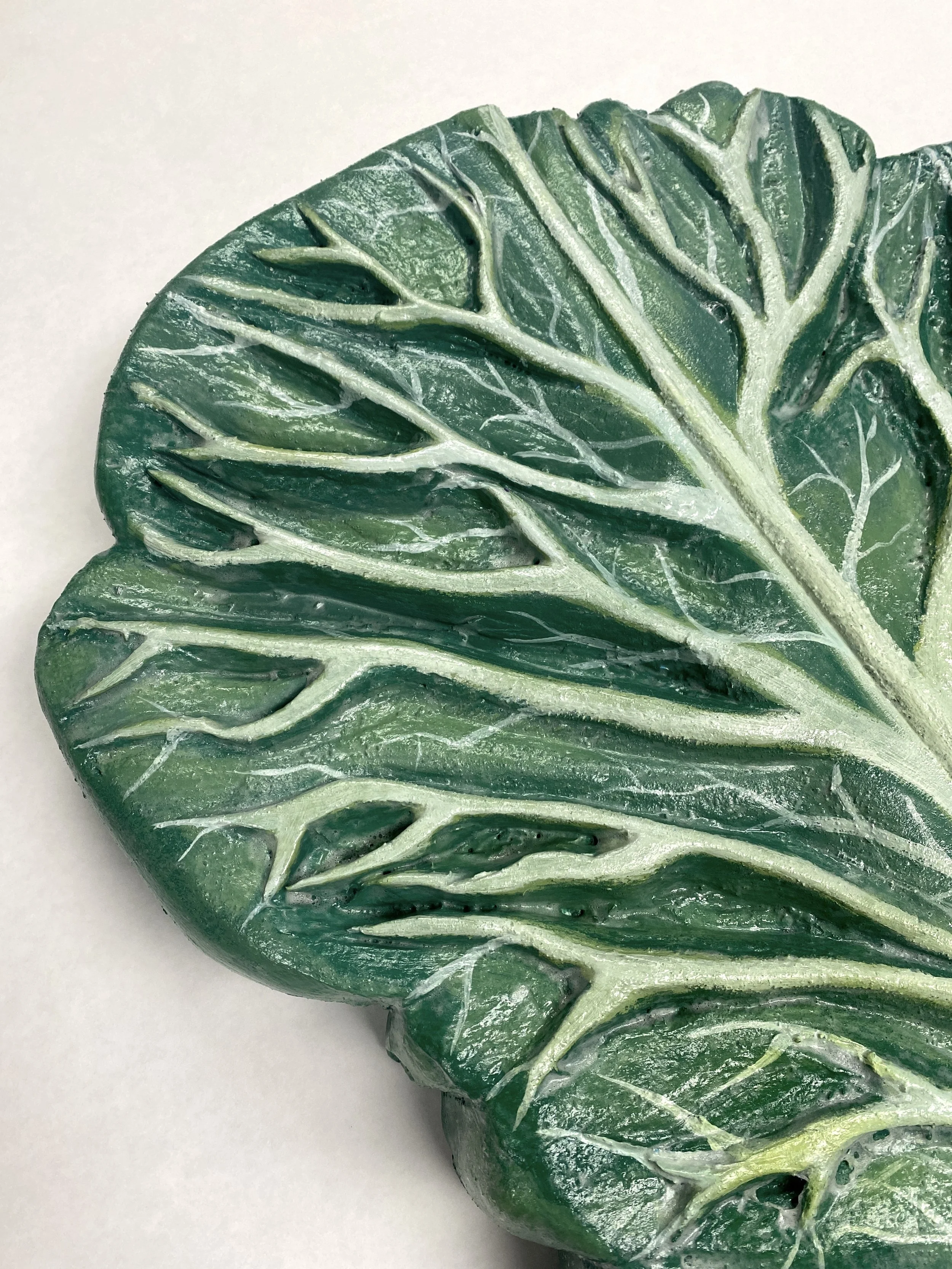 Carly holding sculpted foam collard green, one of several 3D vegetable sculptures installed along the entire vegetable wall.